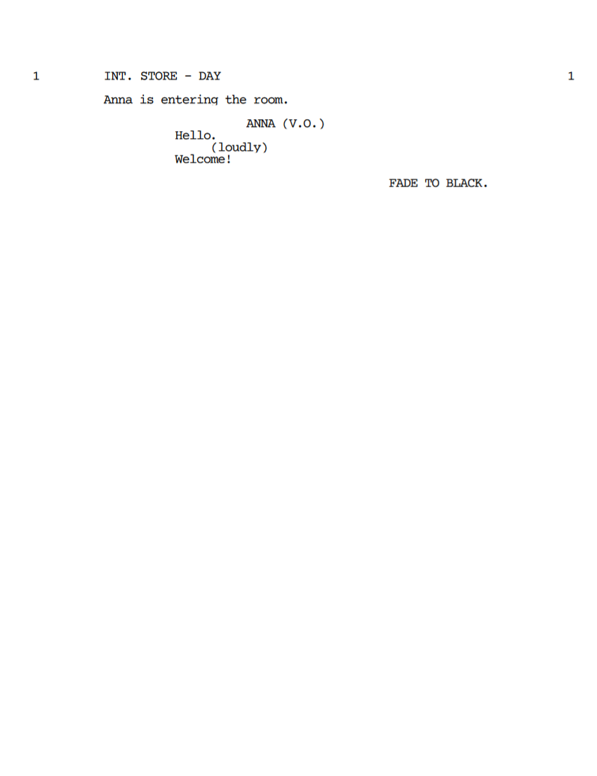 anna (v.o.).. hello (loudly) welcome!Note the two dots after the character name: that's a small 'trick' to remember.